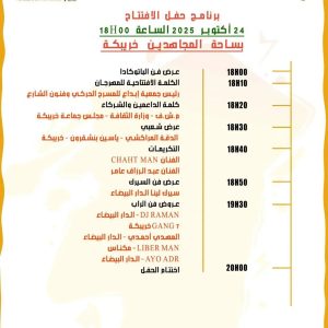 وسيشمل برنامج حفل الافتتاح المنظم يوم الجمعة 24 أكتوبر 2025 على الساعة 18:00 بساحة المجاهدين خريبكة من تنشيط الفنان الموهوب زكرياء بنخلفية و عرض فن الباتوكادا وإلقاء كلمة افتتاحية لرئيس جمعية إبداع للمسرح الحركي وفنون الشارع وإلقاء كلمة الداعمين والشركاء (وزارة الثقافة – المجمع الشريف للفوسفاط (OCP)– مجلس جماعة خريبكة)، يليه تقديم عرض شعبي من أداء الفرقة المراكشية بقيادة ياسين بنشقرون – خريبكة، وفقرة تكريمات التي خصصت هذه الدورة السابعة للفنان CHAHT MAN والفنان المسرحي الخريبكي عبد الرزاق عامر مع عرض في فن السيرك من تقديم سيرك لينا – الدار البيضاء و عروض فن الراب بمشاركة: