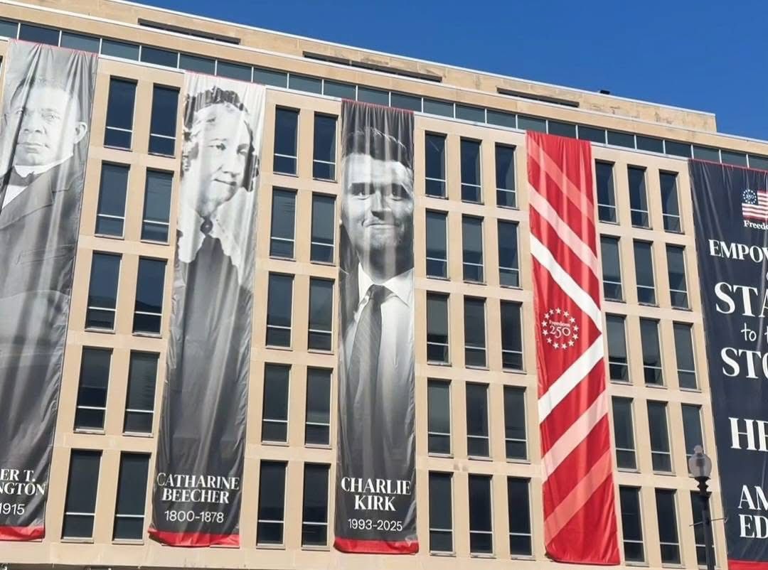 علّقت وزارة التعليم الأمريكية لافتة ضخمة للناشط المحافظ Charlie Kirk على واجهة مقرها في واشنطن العاصمة، ضمن عرض خاص يكرّم ما وصفته الوزارة بـ“الرواد في التعليم الأمريكي”، وذلك بالتزامن مع استعداد الولايات المتحدة للاحتفال بمرور 250 عاماً على تأسيسها عام 2026. 🇺🇸