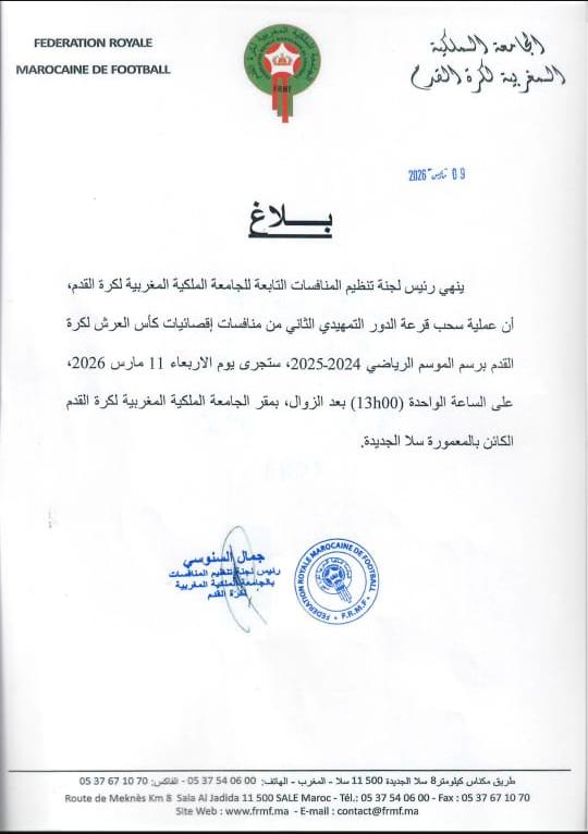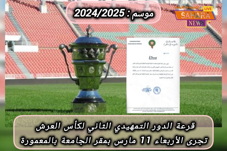 أعلنت لجنة تنظيم المنافسات التابعة للجامعة الملكية المغربية لكرة القدم أن عملية سحب قرعة الدور التمهيدي الثاني من منافسات إقصائيات كأس العرش لكرة القدم برسم الموسم الرياضي 2024-2025 ستجرى يوم الأربعاء 11 مارس 2026 على الساعة الواحدة بعد الزوال بمقر الجامعة الملكية المغربية لكرة القدم الكائن بالمعمورة سلا الجديدة.