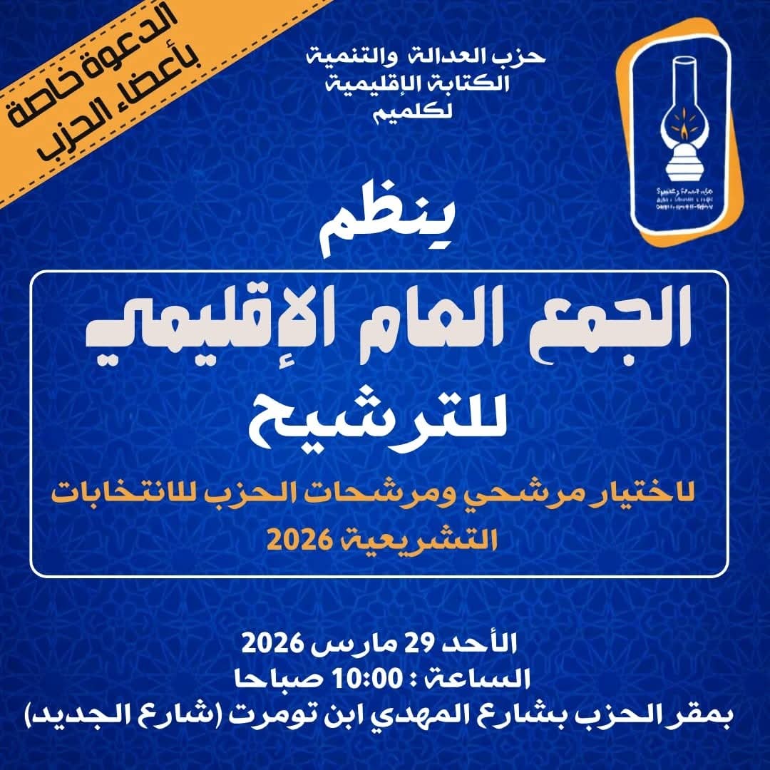 دعت الكتابة الإقليمية لحزب العدالة والتنمية بكلميم، عموم أعضائها إلى حضور الجمع العام الإقليمي المخصص لاختيار مرشحي ومرشحات الحزب للانتخابات التشريعية المقبلة، وذلك يوم الأحد 29 مارس 2026 على الساعة العاشرة صباحاً، بمقر الحزب بمدينة كلميم.