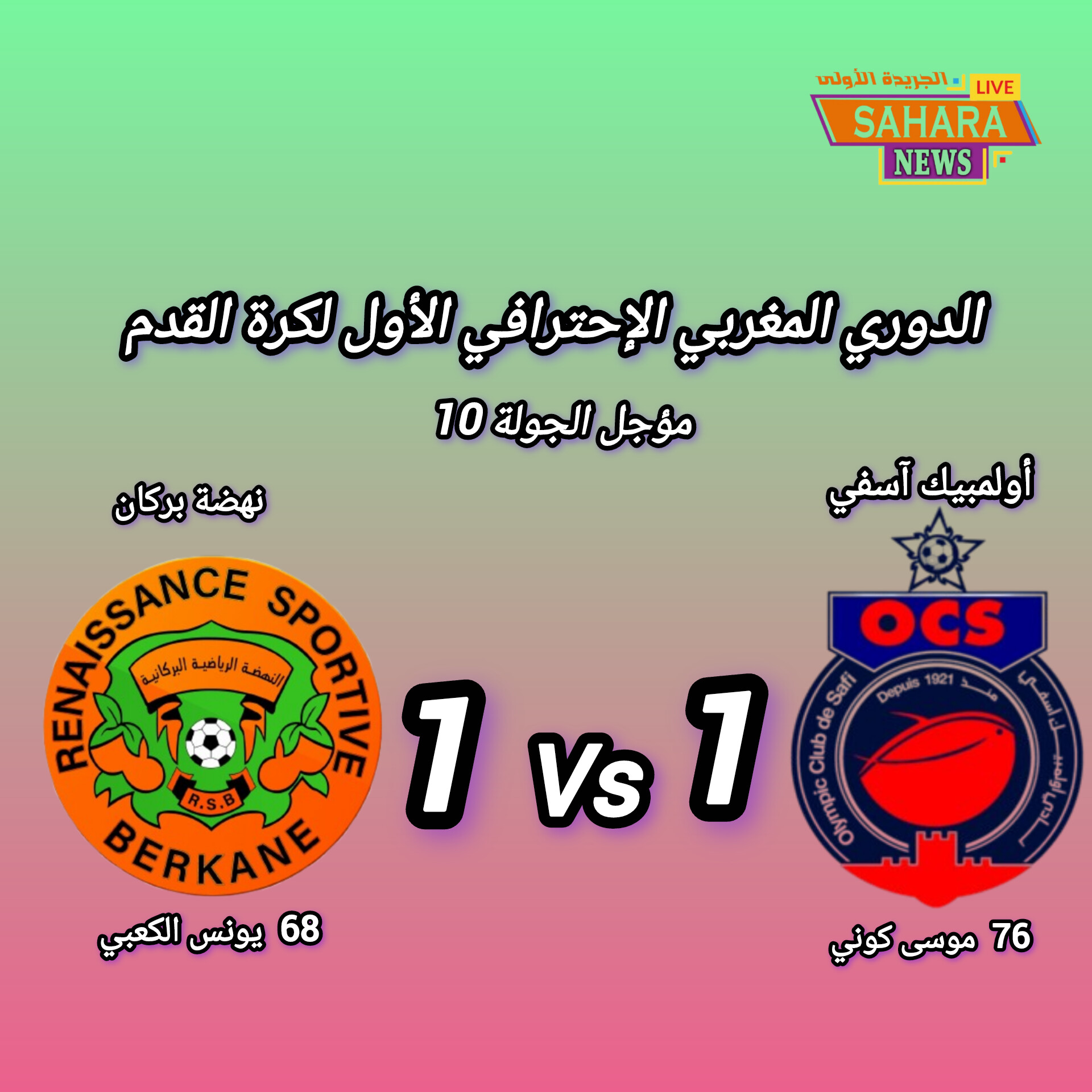 في مواجهة مؤجلة عن الجولة العاشرة من البطولة الاحترافية اكتفى فريق أولمبيك آسفي بنتيجة التعادل الإيجابي (1-1) أمام ضيفه نهضة بركان في اللقاء الذي جمع بينهما مساء الأربعاء 1 أبريل 2026، في مباراة اتسمت بالندية والتكتيك العالي لكنها انتهت بخيبة أمل للفريقين.
