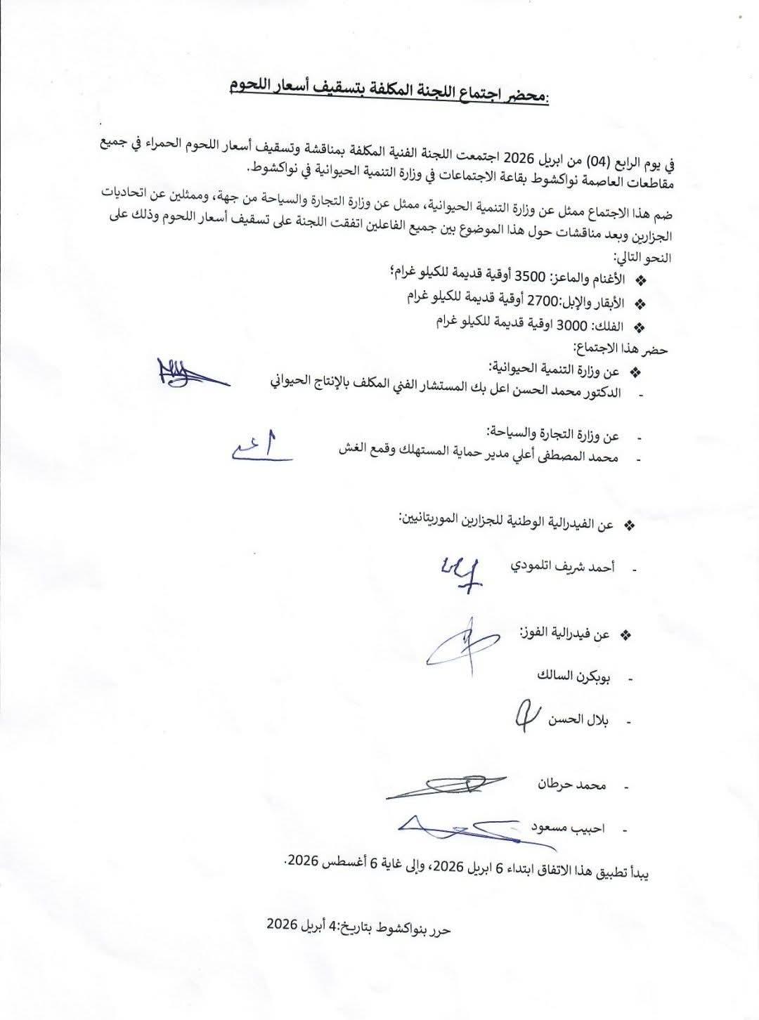 ووفق إيجاز نشرته صفحة الوزارة، يحدد القرار سعر كيلوغرام لحم الضأن والماعز عند 3500 أوقية قديمة، مقابل 2700 أوقية قديمة لكيلوغرام لحم الإبل والبقر، فيما تم تحديد 3000 أوقية قديمة كسعر لكيلوغرام “الفلكه”.