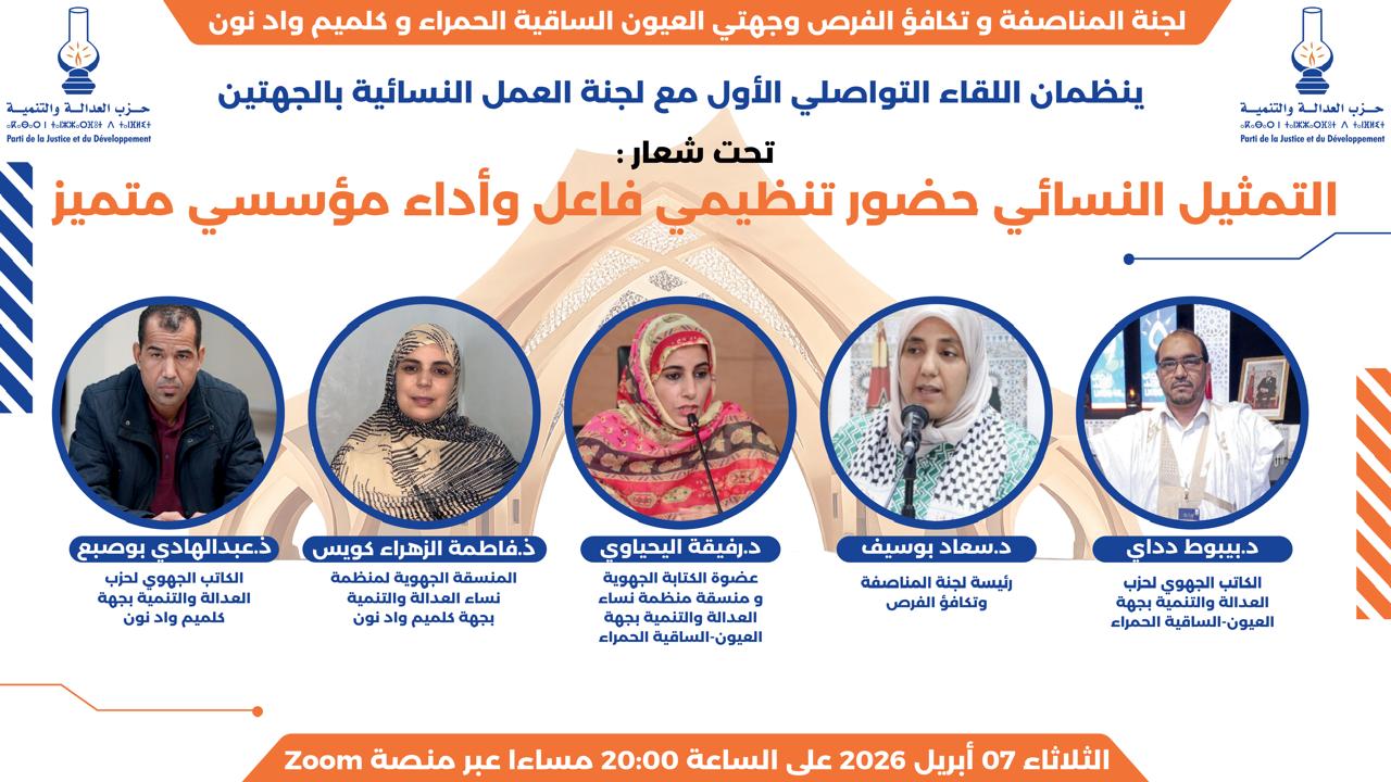 تنظم لجنة المناصفة وتكافؤ الفرص لحزب العدالة والتنمية بجهتي العيون الساقية الحمراء وكلميم واد نون، مساء يوم غد الثلاثاء 7 أبريل 2026، اللقاء التواصلي الأول مع لجنة العمل النسائي، وذلك عبر منصة “زوم” ابتداءً من الساعة الثامنة مساءً، تحت شعار: “التمثيل النسائي حضور تنظيمي فاعل وأداء مؤسسي متميز”.