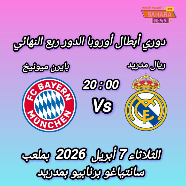 تتجه أنظار عشاق كرة القدم الأوروبية مساء اليوم الثلاثاء 7 أبريل 2026 إلى ملعب سانتياغو برنابيو بالعاصمة الإسبانية مدريد حيث يستقبل فريق ريال مدريد نظيره بايرن ميونيخ الألماني في مواجهة نارية لحساب ذهاب الدور ربع النهائي من دوري أبطال أوروبا وذلك انطلاقا من الساعة الثامنة مساء،