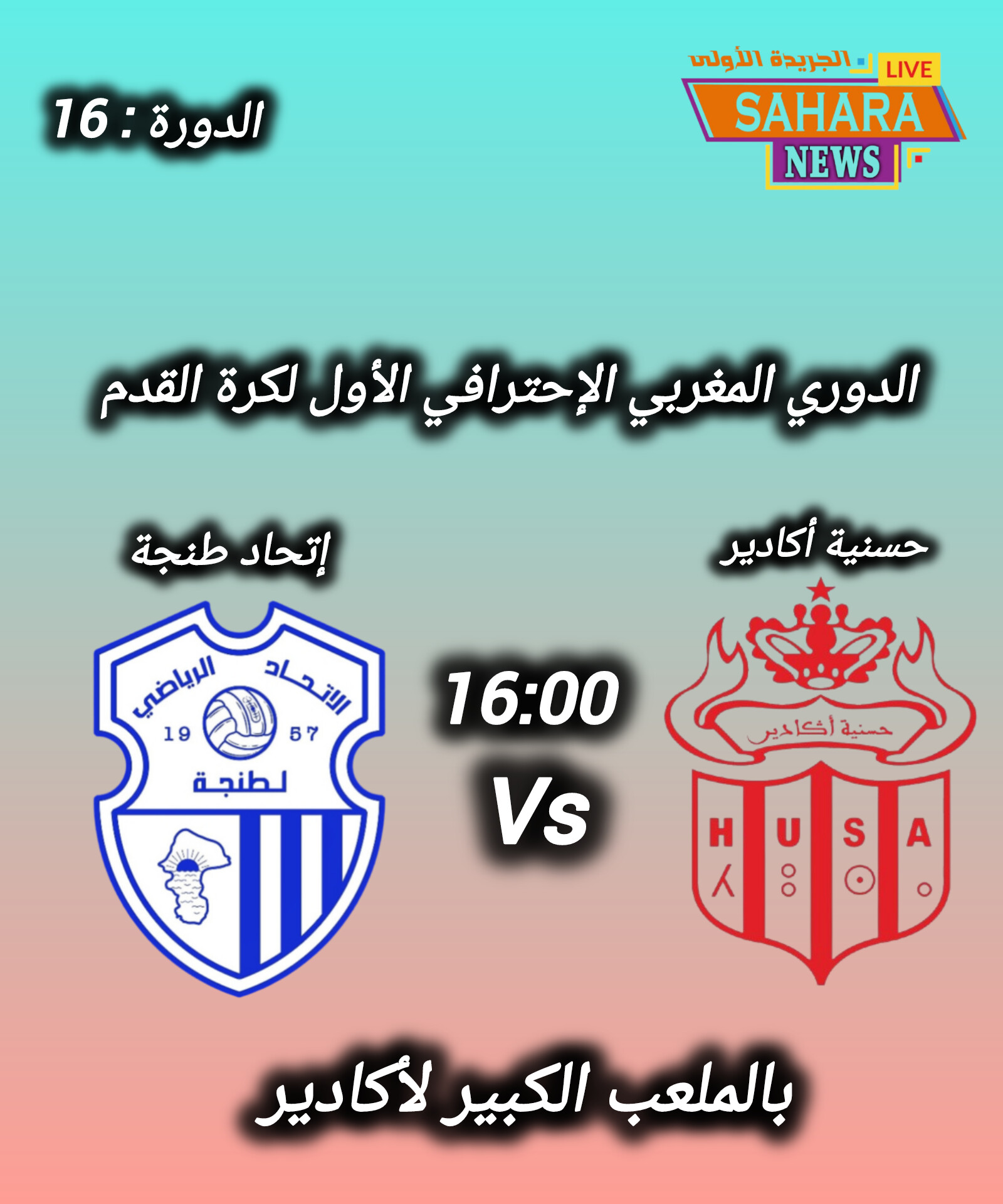 تتجه أنظار عشاق كرة القدم الوطنية مساء يوم السبت 25 أبريل 2026 إلى أرضية الملعب الكبير بمدينة أكادير حيث يستقبل فريق حسنية أكادير ضيفه اتحاد طنجة انطلاقًا من الساعة الرابعة عصرًا برسم الجولة السادسة عشرة من الدوري المغربي الاحترافي الأول، في مواجهة تحمل طابعًا خاصًا عنوانه: “بداية جديدة بطموحات كبيرة”.
