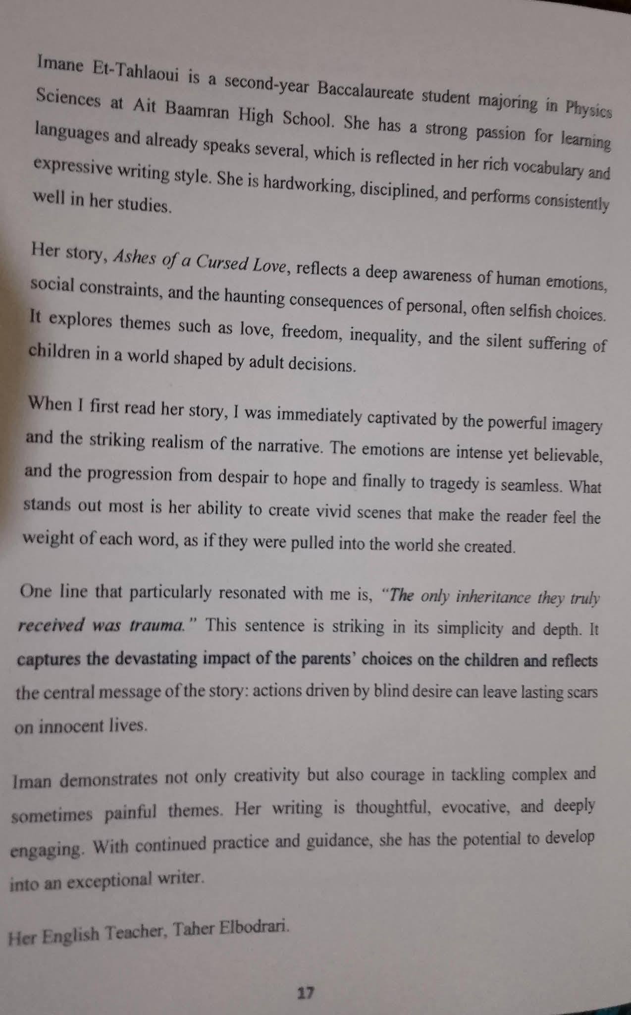 أصدرت التلميذة المجتهدة إيمان التهلاوي التي تتابع دراستها بالسنة الثانية بكالوريا بالثانوية التأهيلية أيت بعمران بجماعة تيوغزة اقليم سيدي إفني قصتها بعنوان ” رماد حب ملعون ” باللغة الانجليزية تحت تأطير الأستاذ المحترم طاهر البدراري..